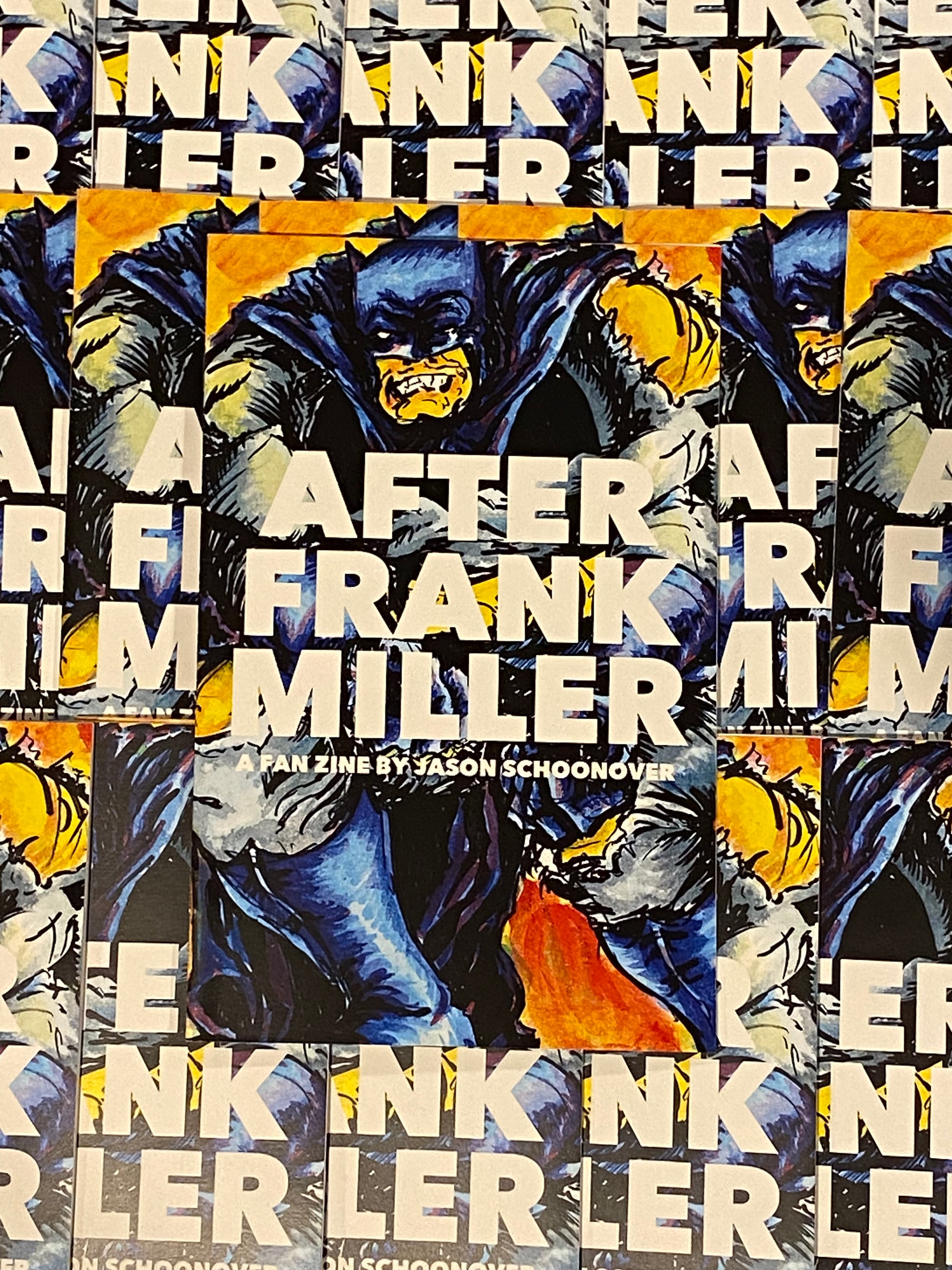 A fan art tribute zine to legendary comic artist and writer Frank Miller. The format of the book is 16 different riffs of the icon Dark Knight Triumphant pose with different characters both fictional.